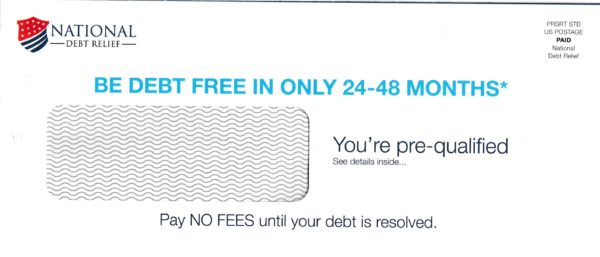 As part of my I Buy Junk Mail offer a reader has submitted a mailer from National Debt Relief (NDR).